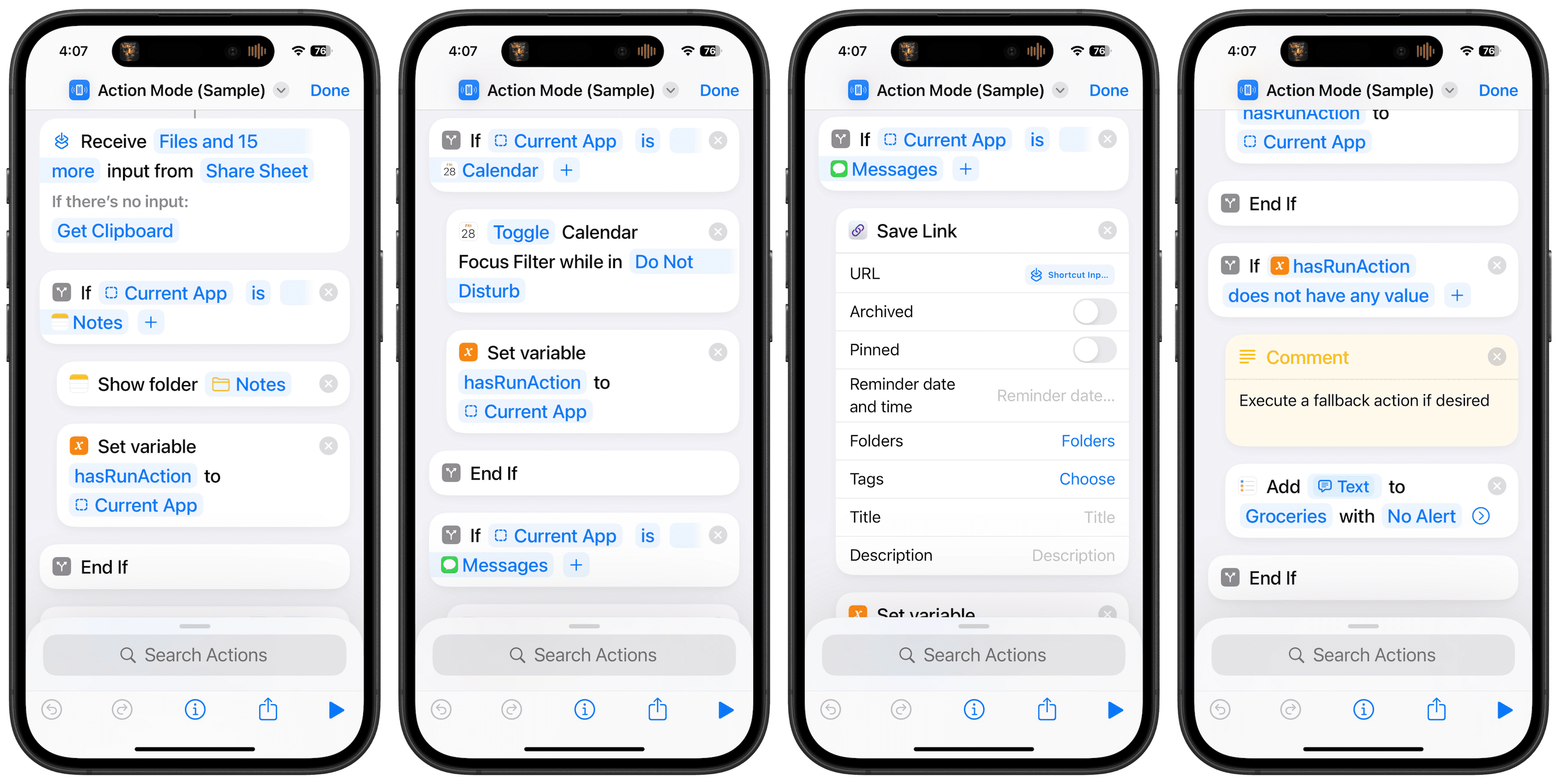Now that we have all of the necessary pieces, we can build out our custom App-Specific Action Button workflow. (I’ve called mine Action Mode.)
